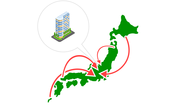 往路は全国各地から飛行機や新幹線・マイカーなどで目的地に集合しホテルで会議・宴会をして翌日は自由解散のような手配が可能です。